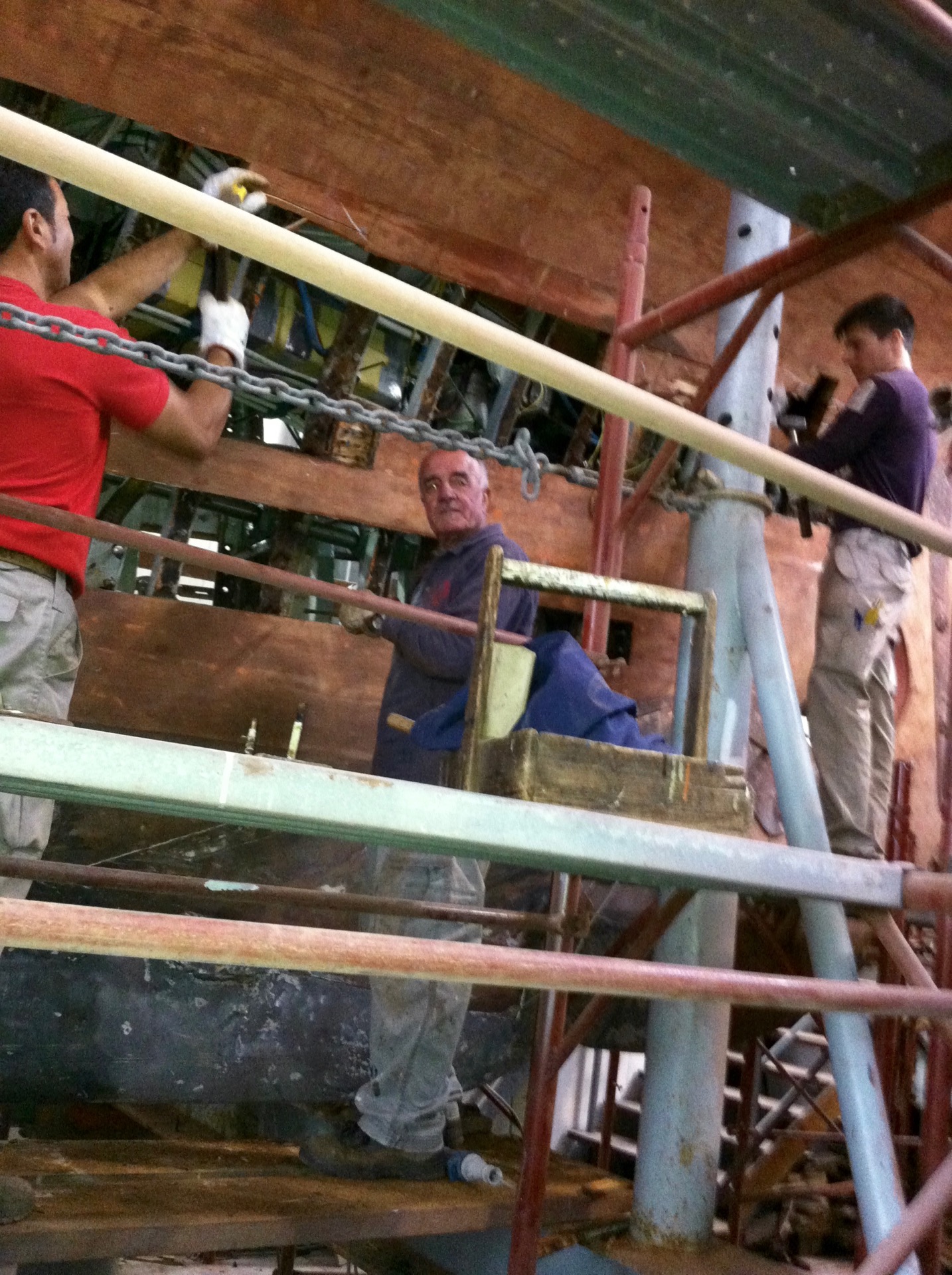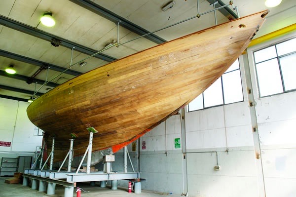 Entra nel cantiere Del Carlo di Viareggio durante il periodo invernale per effettuare lo smontaggio dei madieri, la messa in opera di nuovi perni di fissaggio e la sostituzione della gomma della coperta.